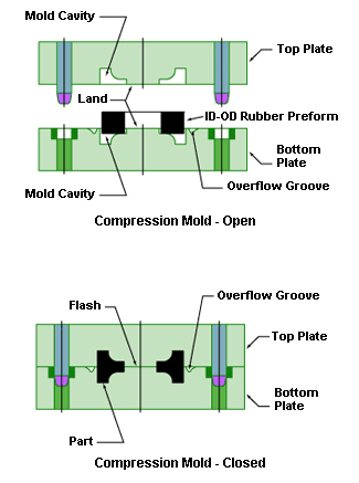 The rubber compression molding process begins with a piece of uncured rubber which has been performed to a controlled weight and shape. This preform is placed directly into the rubber mold cavity prior to mold closure. As the mold is closed, the material is compressed between the plates causing the compound to flow to fills the cavity. The material is held in the mold under high pressure and elevated temperature to activate the cure system in the rubber compound (rubber is vulcanized). The cycle time is established to reach an optimal level of cure. At the end of the cycle, the parts are removed or ejected from the cavities and the next cycle begins.Advantages of Rubber Compression Molding:
